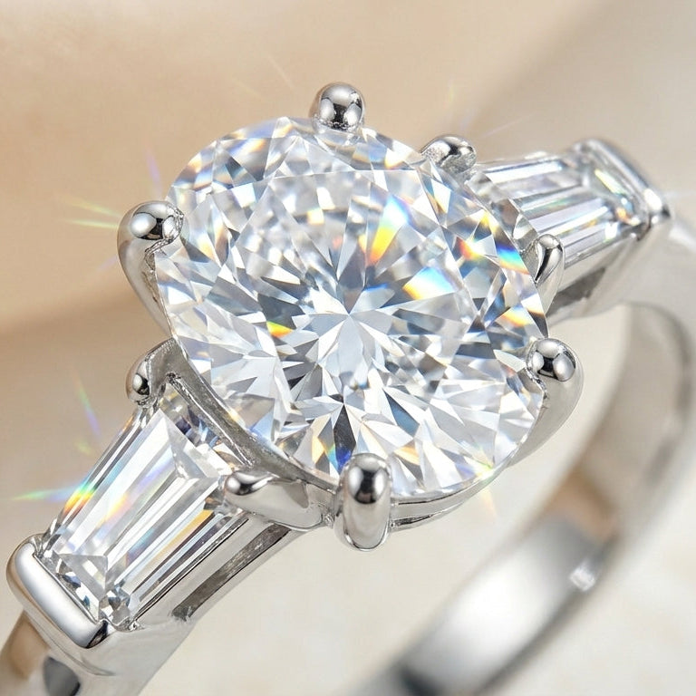 The oval-cut moissanite center stone captures and reflects light beautifully, producing extraordinary fire and brilliance that rivals traditional diamonds. Crafted in solid 925 sterling silver, this ring blends durability, elegance, and everyday comfort.
